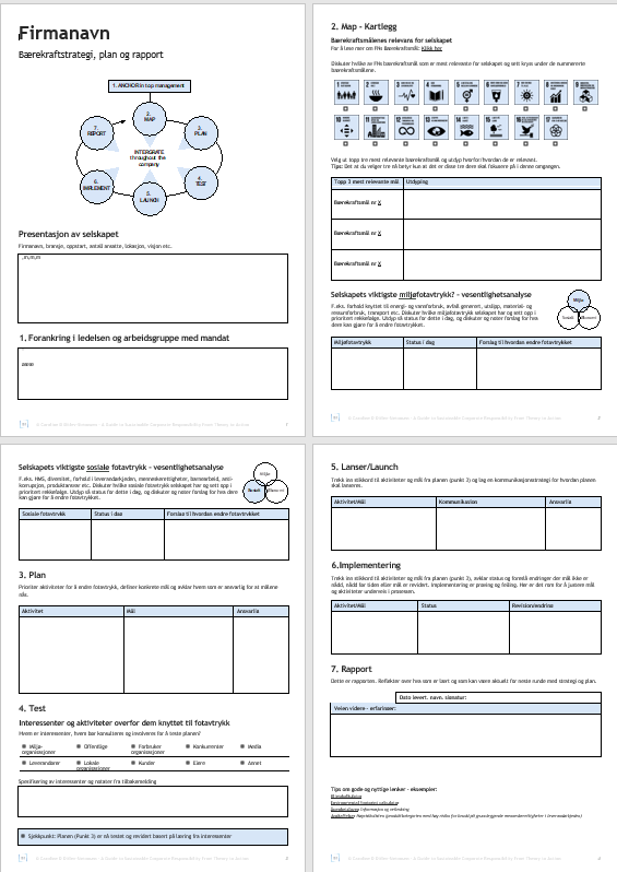 I boken Strategi for bærekraftig forretningsdrift (universitetsforlaget.no) kan du lese om oppskrift for innføring av bærekraft i bedriften samt rapportering. Malen ligger under og er tilgjengelig via email.